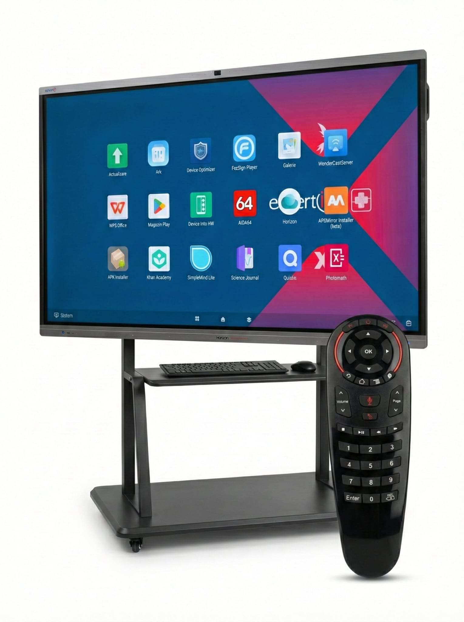 Display interactiv (tablă interactivă) HORIZON A3C, 65″, 4K UHD, 24/7, 450nit, panel VA, D-LED, 7ms, contrast static 5000:1, contrast dinamic 100000:1, mătuire 25%, 100,000 ore, Android 14, OTA, DMS*, CPU A76*4 + A55*4, GPU Mali G610 MP4, RAM 8GB, stocare 128GB. Acoperire gamă culori 72%, suport HDR10. Aplicatii pre-instalate: Whiteboard, Browser web, WPS Office, EDLA upgrade (Play Store, Youtube, Youtube Music, Calendar, Chrome, Gmail, Maps, Google TV, Google Meet, Drive). Touch: zero bonding, IR, precizie touch ±1mm, reacție touch <6ms, dimensiune minimă obiect 2mm, mărime minimă scris 2.5mm, deget + creion + obiect opac + detecție palmă, culori duble, 2 capete, 45 puncte touch, adnotare pe orice sursă, compatibil Windows 11/10/8/7/XP / Android / Mac / Linux / Chrome, interfață cu suport multilingvistic (36 de limbi, inclusiv: turcă, maghiară, germană și română implicit). Conectivitate: WiFi 6 + hotspot, BT 5.1, NFC (Screen Mirroring), WonderCast încorporat, 1xVGA, 1xDP1.2, 3xHDMI (1 fata, 2 spate), 2xUSB-C (1x65W frontal, 1x15W spate), 1xUSB2.0 (spate), 4xUSB-A3.0 (2 frontal, 2 spate), 3xUSB touch (1 frontal, 2 spate), interfață OPS 19V 80pin (opțional modul OPS-PC Windows 10 Enterprise SAC), 1xSD/TF Card Slot, 2xLAN (in/out, 10M/100M/1000M), 1xRS232C, 1xLine-In, 1xMic-In, 1xHDMI Out, 1xSPDIF Out, 1xLine Out, cameră 8MP (48MP în fotografie), câmp vizual 120° diagonală, 110° orizontală, 75° verticală, deformare imagine ≤2.5%, urmărire interlocutor, senzor lumină, microfon omni-direcțional cu 8 zone, reducere ecou, anulare inteligentă zgomot fundal, distanță captare voce 12m. Sticla protectie 3.2mm, rezistență 8H, anti-zgârieturi, anti-reflex, boxe 2x15W + 25W subwoofer, rama 33mm T 18mm L/R 46mm B, culoare titanium gri + laterale negre, aluminium, dimensiuni 1491.9×910.6×82.3mm, VESA 600×400, M8 25mm, greutate 37.6kg, consum tipic 145W, consum max ≤230W. Accesorii incluse: 1x cablu alimentare (1.5m), 2x creioane pasive cu prindere magnetică de ramă, 1x cablu HDMI 2.0 (3.5m), 1x cablu USB, telecomanda, manual de utilizare, certificat de garanție, certificate CE, REACH, RoHS, WEEE