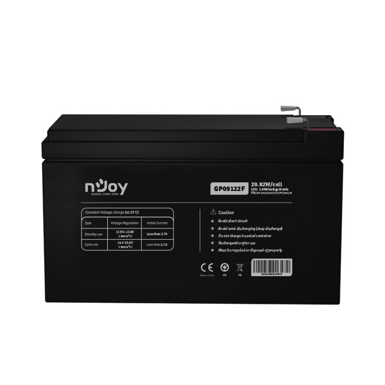 ACUMULATOR NJOY GP09122F 12V Tip VRLA AGM Terminale F2 Durata teoretica de viata in mod asteptare pana la 5 ani Cycle Use 14.4V-15.0V (-30mV/C), max. Current: 2.7A Float Use 13.5-13.8V (-20 mV/C) https://www.njoy.global/product/gp09122f?el=resources