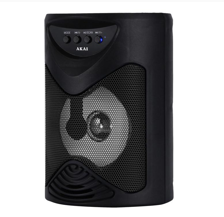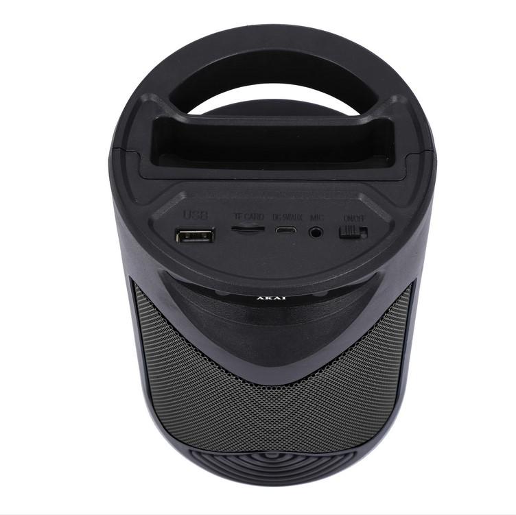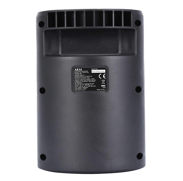 Boxa portabila Akai ABTS-704, Bluetooth 4.2, radio FM, 1x port USB pentru mp3 player, 1x slot card TF, lumini LED, baterie reincarcabila, 1x slot pentru microfon, timp de incarcare 2 ore, timp de folosire 1.5 ore la volum maxim