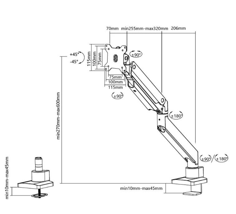 Neomounts by Newstar Select NM-D775BLACK full motion desk mount for 10- 32″ monitor screen, height adjustable (gas feather) – black Specifications General Min. screen size*: 10 inch Max. screen size*: 32 inch Min. weight: 1 kg Max. weight: 16 kg Screens: 1 VESA pattern: 75×75, 100×100 mm VESA minimum: 75×75 mm VESA maximum: 100×100 mm Desk mount: Grommet, Clamp Functionality Type: Full motion, Tilt, Rotate, Swivel Tilt (degrees): 120° Swivel (degrees): 360° Rotate (degrees): 190° Depth: 0-63 cm Height: 27-60 cm Height adjustment: Gas spring Lockable: Not lockable Clamp range: 8,5 cm https://www.neomounts.com/home-office-solutions/monitor-desk-mounts/nm- d775black-neomounts-by-newstar-select-monitor-desk-mount/