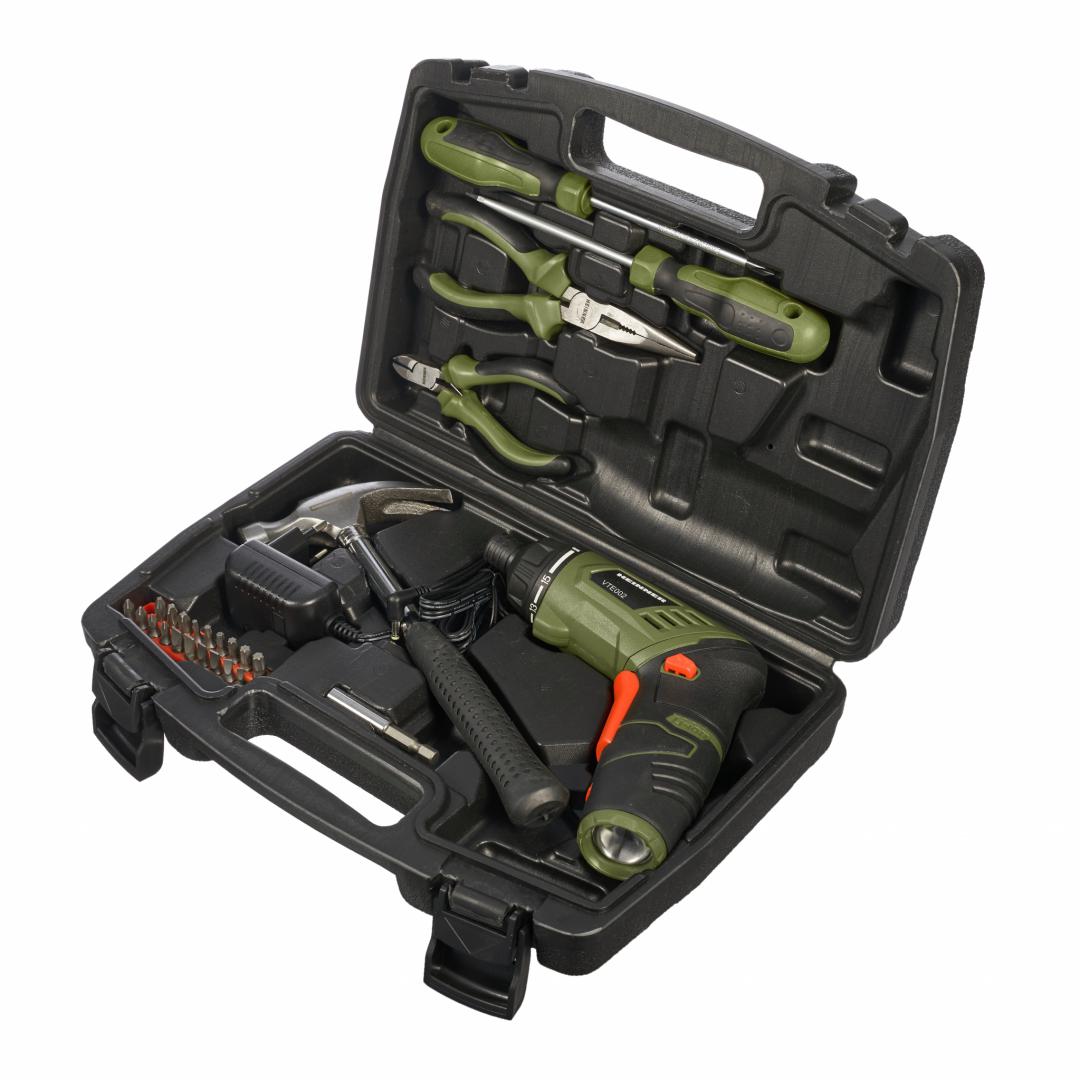 1 incarcator; 1 surubelnita  SL6 X 100; 1 surubelnita PH2 X 100; patent cu varf lung 15 cm; patent sfic de 11.5 cm; 20 biti (25L); suport magnetic biti; ciocan 230 grame